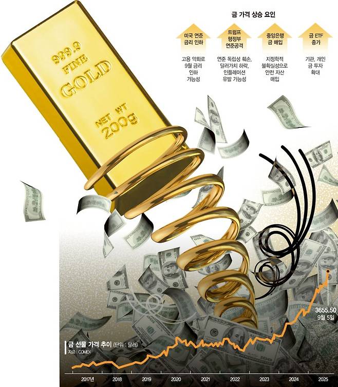 금 가격은 지난 몇 년간 지속적으로 상승했다. 지난 2023년 하반기부터 가파르게 올랐다. 특히 도널드 트럼프 미국 대통령 취임 이후에는 상당한 상승폭을 보였다. 실제 2023년 하반기 금 가격은 트로이온스(31.1g)당 2000달러였다. 그러나 그 이후 급격히 상승해 최근 1년간 45%가량 높아져 현재 트로이온스당 3500달러를 돌파했다. 올해 들어서만 35% 이상 상승했다. 선물 가격 역시 3655.50달러로 각각 역대 최고치를 기록하고 있다. 파이낸셜타임스(FT)는 "세계 주요 자산 가운데 가장 뛰어난 수익률을 기록하고 있다"고 전했다.