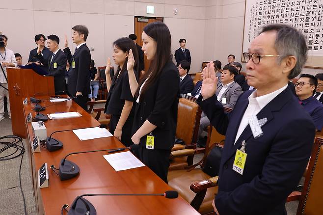 | ▲ 5일 서울 여의도 국회에서 열린 법제사법위원회 검찰 개혁 입법청문회에서 출석 증인을 대표한 이희동 부산고검 검사를 비롯한 증인들이 선서하고 있다. 우측 끝 남성이 조경식 전 부회장. 2025.9.5 |