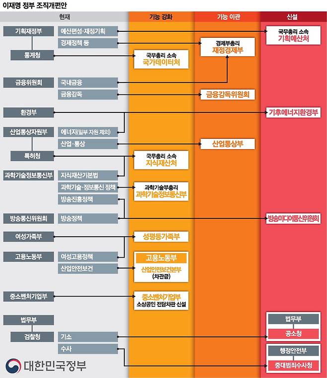 기재부 산하에 있던 통계청이 총괄·조정 기능을 강화해 총리실 소속 국가데이터처로 격상된다. 산업통상자원부 산하 특허청도 지식재산처로 이름을 바꾸고 격상돼 총리실 아래로 이관된다.