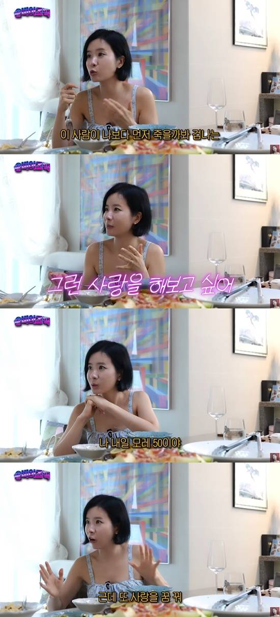 이어 "이 사람이 나보다 먼저 죽을까 봐 겁나는 그런 사랑을 해보고 싶다. 난 진짜 사랑을 믿는다"라며, "(내가) 내일 모레 50이다. 근데 또 사랑을 꿈꾼다. 내 마지막 사랑은 어딘가 있을 거다"라고 고백했다.