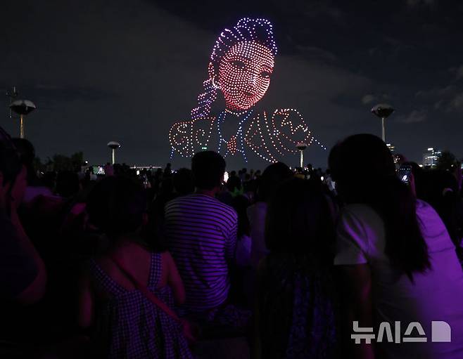 [서울=뉴시스] 김진아 기자 = 7일 서울 광진구 뚝섬한강공원에서 '케이팝 데몬 헌터스(케데헌)'를 주제로 한 '2025 한강 불빛 공연(드론 라이트 쇼)'가 펼쳐지고 있다. 2025.09.07. bluesoda@newsis.com