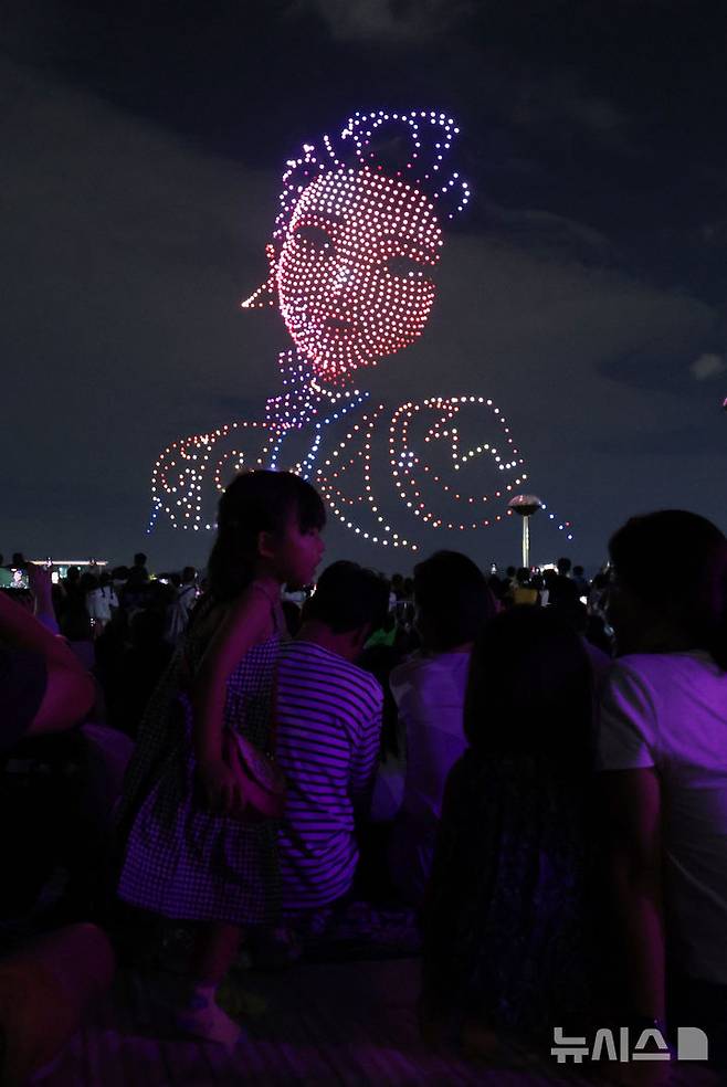[서울=뉴시스] 김진아 기자 = 7일 서울 광진구 뚝섬한강공원에서 '케이팝 데몬 헌터스(케데헌)'를 주제로 한 '2025 한강 불빛 공연(드론 라이트 쇼)'가 펼쳐지고 있다. 2025.09.07. bluesoda@newsis.com