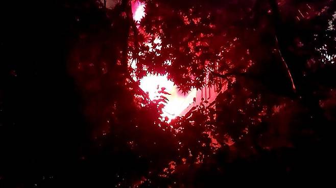 비가 오는 차창 왼편으로 시뻘건 불꽃이 보입니다.