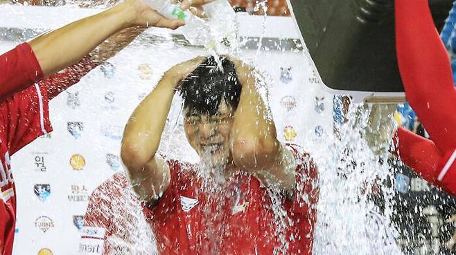 ▲ SSG 랜더스 김광현이 7일 LG 트윈스전에서 개인 통산 2천 탈삼진을 기록한 뒤 경기 후 동료들로부터 축하 물벼락을 맞고 있다.