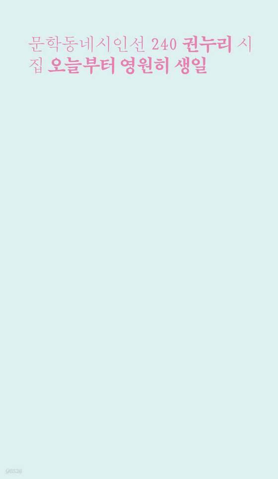 지난달 25일 출간된 권누리(30) 시인의 시집 『오늘부터 영원히 생일』(문학동네·아래 사진)의 제목은 이런 시구 중에 등장한다. “한여름이 정수리에 쏟아진다/투명하게 빛나는 손바닥/오늘부터 영원히 생일을 축하받고 싶다…”( ‘오래된 섬광’ 일부)