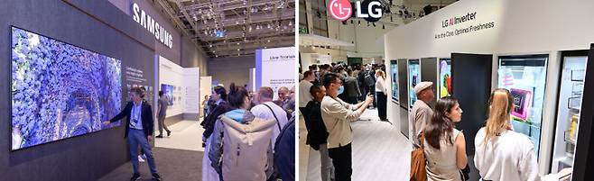 | 최대 가전전시회 ‘IFA’… 삼성-LG 방문 관람객들 독일 베를린에서 열린 유럽 최대 가전 전시회 ‘IFA 2025’에 참가한 삼성전자(왼쪽 사진)와 LG전자. 관람객들이 삼성전자가 세계 최초로 출시한 115인치 마이크로 RGB TV와, 인공지능(AI) 가전을 실생활에서 제대로 활용할 수 있게 도와주는 ‘LG AI홈’ 솔루션 등을 둘러보고 있다. 삼성전자·LG전자 제공 |