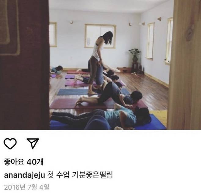 이와 함께 이효리는 2016년 아난다제주 오픈 첫날 작성했던 SNS 게시글도 공유했다. 이효리는 요가복을 입고 수강생들에게 요가를 가르치고 있는 모습이다. 그는 '첫 수업. 기분 좋은 떨림'이라고 설렘을 드러내기도 했다.