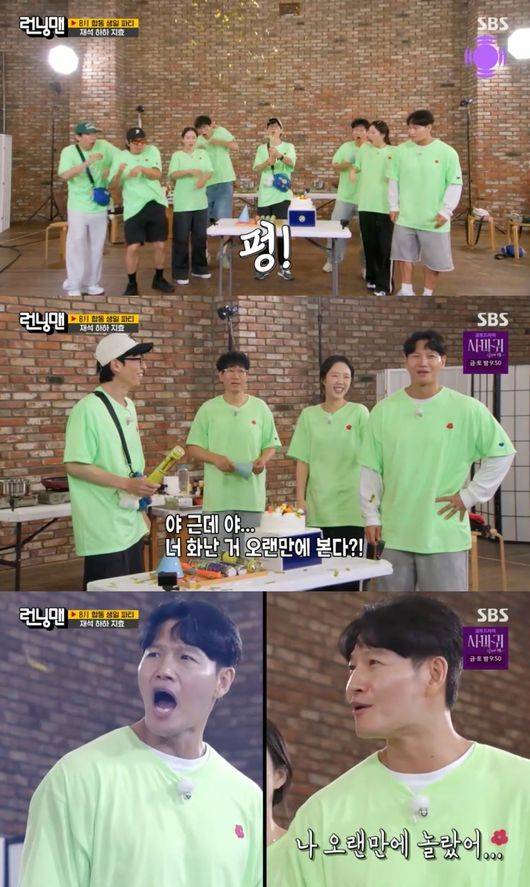 이어 멤버들은 김종국의 깜짝 결혼 발표 이후 한 박자 늦게 준비된 8월 생일자 생일파티도 함께했다. 분위기가 무르익던 중 지석진은 “이거 무섭다”며 잔뜩 움츠러든 채 폭죽을 발견했고, 유재석은 “이거 왜 못 쏘냐”고 장난을 치기 시작했다. 결국 제작진의 설명 도중 유재석 손에서 폭죽이 터지며 현장은 아수라장이 됐다. 김종국은 “이야기하고 있잖아. 뭐하는 거야”라며 호통쳤고, 지석진은 “이런 미X 메뚜기. 깜짝 놀랐네”라며 경악했다. 유재석은 “나 너 화난 거 처음 본다”고 말했고, 김종국 역시 “나 오랜만에 놀랐다”며 웃음을 자아냈다.
