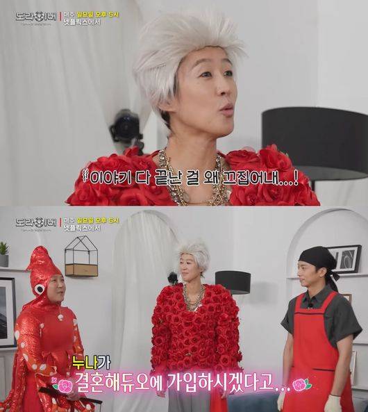 홍진경이 "지금 다 이야기 끝난 걸 왜 또 끄집어 내냐. 여기 오는 길에 다리가 천근만근이었다"라고 토로했지만, 조세호는 "우리끼리니까 할 수 있는 이야기인데, 누나가 이제 '듀오'(결혼정보 회사)에 가입하시겠다고 하더라"라고 폭로해 폭소를 자아냈다.