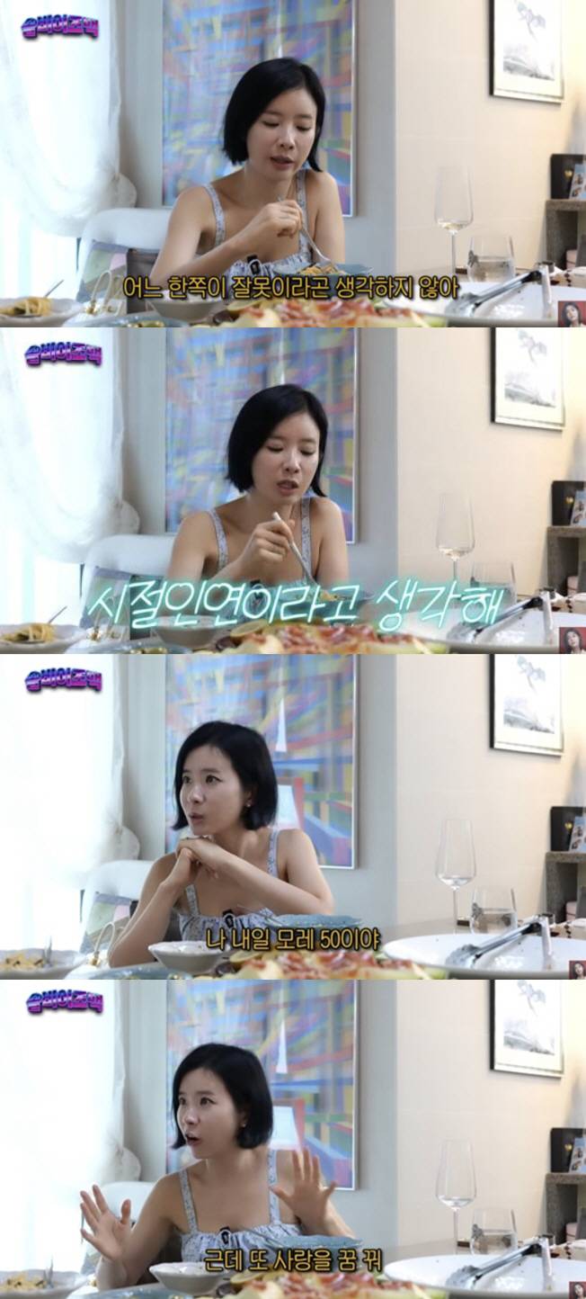 박기영은 요즘 JTBC '이혼 숙려 캠프'에 빠졌다는 솔비의 말에 "나도 이혼 경험이 있지만 어느 한쪽의 잘못이라고 생각하지 않는다. 시절인연인 것 같다. 그 사람과 나하고의 인연의 시간이 딱 그만큼 이었다는 것"이라고 말했다.