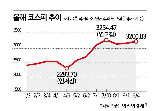 새 정부 출범 기대감에 힘차게 출발했던 코스피가 박스권에 갇혔다. 이재명 대통령이 '코스피 5000시대'를 강조하면서 기대감에 한껏 부풀었던 코스피는 3년6개월 만에 3000선을 회복했다. 이어 3200선마저 넘어서면서 2021년 6월 기록한 전고점(3316.08) 돌파에 대한 기대감이 커졌다. 하지만 전고점 돌파는 미뤄졌다. 정부가 7월말 발표한 세제 개편안이 투자자들의 기대에 한참 못미쳤기 때문이다. 기대는 실망으로 바뀌었고 세제 개편안 발표 다음날인 8월1일 코스피는 3.88% 급락하며 이재명 정부 출범 이후 최대 낙폭을 기록했다. 이후 코스피는 3100~3200선의 좁은 박스권에 갇혀버렸다.