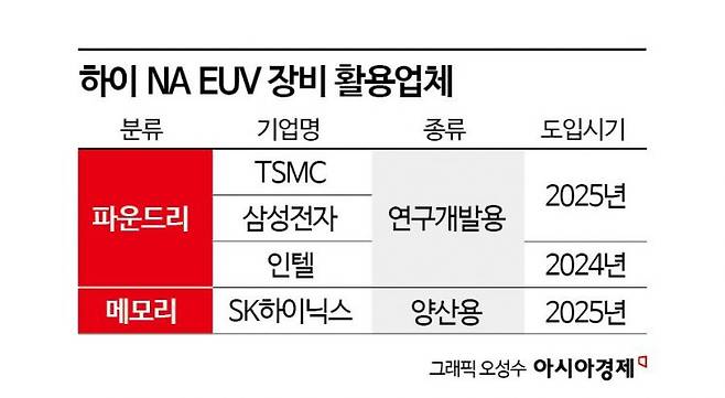 하이 NA EUV는 먼저 파운드리 업체들이 연구개발(R&D)에 활용해왔다. 인텔은 지난해 미국 오리건주 연구개발 센터에 반도체 업계 최초로 이 장비를 설치했다. 인텔은 당시 ASML이 한 해 생산할 수 있는 장비 5~6대가량을 선제 확보한 것으로 알려졌다. 삼성전자도 올해 3월 국내 업계 중 처음으로 화성캠퍼스 2㎚ 이하 차세대 반도체 공정에 이 장비를 배치했다. TSMC도 최근 해당 장비를 반입한 것으로 전해졌다.