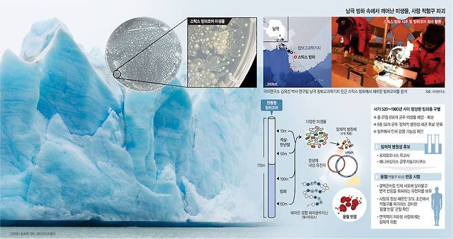 ◇결핵균과 비슷한 미생물 발견= 극지연의 김옥선 박사 연구팀은 지난달 27일 스틱스 빙하 코어를 분석해 총 27종, 656개의 균주를 배양·확보하는 데 성공했다고 밝혔다. 스틱스 코어의 10m, 50m, 100m, 150m 지점에서 표면을 물리적으로 채취하고 이 시료에서 균주를 배양해낸 것이다. 총길이 210m 중 170m보다 깊은 지점은 흙 등 이물질이 혼재돼 대상에서 제외됐고, 완전한 얼음과 만년설로 이뤄진 부분만을 분석했다. 대부분은 남극 환경이나 일반 자연에서 흔히 발견되는 세균이었다. 그러나 그중 9종 55개 균주는 ‘잠재적 병원성 세균 후보’로 분류됐다.