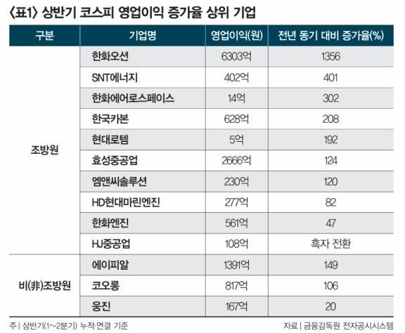한국거래소에 따르면 1~8월 코스피에서 가장 높은 주가 상승률을 보인 종목은 웅진이었다. 상승률469%를 기록했다. 2~10위는 에이피알(354%), 엠앤씨솔루션(318%), 현대로템(287%), HD현대마린엔진(276%), 두산2우B(266%), 두산에너빌리티(252%), SNT다이내믹스(234%), 두산우(221%), HJ중공업(218%)이었다. 이어 효성중공업, 코오롱, 한화, 한화오션, SNT홀딩스, 한국카본, 한화에어로스페이스, 노루홀딩스, 한화엔진, SNT에너지가 각각 157~216% 상승률을 보이며 11~20위에 올랐다.주가 상승률 상위권에는 최근 시장에서 주목받고 있는 '조방원'(조선·방산·원전) 기업이 포진했다. 이들 대부분은 지난해부터 이어진 대규모 수주로 상반기(1~2분기) 영업이익이 크게 개선됐다(표1 참조). 특히 한화오션 영업이익이 전년 동기 대비 1356% 급증해 약진이 두드러졌다. 2023년 전신인 대우조선해양이 한화그룹에 편입된 뒤 저가 수주 비중을 줄이고 고부가 선박(LNG선 등) 위주로 수익성을 끌어올린 결과다. 그룹 내 방산 계열사 한화에어로스페이스와 군·특수선 사업 경쟁력도 강화하고 있다. 같은 기간 SNT에너지는 북미 LNG(액화천연가스) 프로젝트 납품 본격화, 인공지능(AI) 데이터센터 냉각 수요에 힘입어 영업이익이 401% 늘었다. 한국형 원전 수주 확대에 따른 납품 기회도 커질 전망이다.