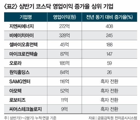 코스닥에서는 1~8월 SGA가 1082%로 주가 상승률 1위에 올랐다. 씨어스테크놀로지, SAMG엔터, 인포바인, 좋은사람들, 로보티즈, 비에이치아이, 아모텍, 지엔씨에너지, 오로라가 각각 241~366% 상승률로 뒤를 이었다. 11~20위는 원익홀딩스(241%), 젬백스(237%), 셀바이오휴먼텍(232%), 비트맥스(225%), 디앤디파마텍(224%), 올릭스(221%), 제이에스링크(220%), 태웅(216%), 마이크로컨텍솔(213%), 미투온(211%)이었다.이들 가운데 지엔씨에너지와 비에이치아이, 셀바이오휴먼텍, 마이크로컨텍솔은 상반기 세 자릿수 영업이익 증가율을 나타냈다(표2 참조). 데이터센터용 비상발전기 시장점유율 1위인 지엔씨에너지는 LG CNS 등 대형 고객사와 공급계약 체결, 해외 발전소 인수에 따른 사업 안정성·수익성 제고로 영업이익이 전년 동기 대비 408% 급등했다. 배열회수보일러(HRSG) 등 전력 설비를 전문으로 하는 비에이치아이는 AI와 전기차 등 글로벌 전력 수요 증가로 호황을 맞으면서 영업이익이 245% 늘었다.
