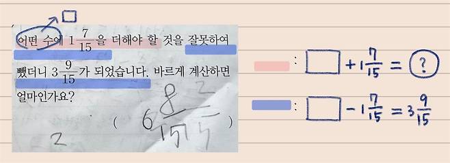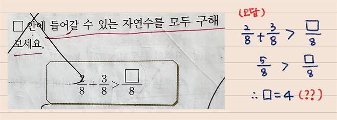 이어 □안에 들어갈 수 있는 "자연수는 모두 몇 개인지, 그중 가장 큰 수는 무엇인지"를 물었다. 같은 식이라도 질문에 따라 답이 달라지기 때문이다. 하지만 비슷한 문제에서 또 실수했다. 결국 문제를 꼼꼼히 읽는 습관이 필요하다.
