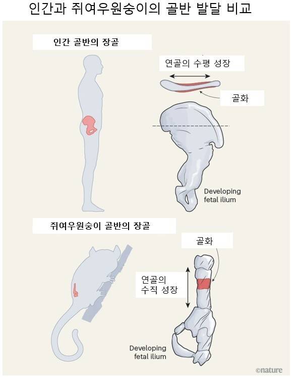 연구진은 세 가지 자료를 비교 분석한 결과, 영장류와 생쥐에선 매우 비슷한 방식으로 장골이 발달한다는 걸 발견했다. 먼저 척추와 평행하게 두 개의 작은 연골 막대(성장판)가 형성되고, 이 막대가 자라나 척추와 결합하면서 연골 세포 대신 뼈세포가 들어섰다. 그러나 놀랍게도 인간의 장골은 발달 단계에서 두 차례에 걸쳐 전혀 다른 모습을 보였다.