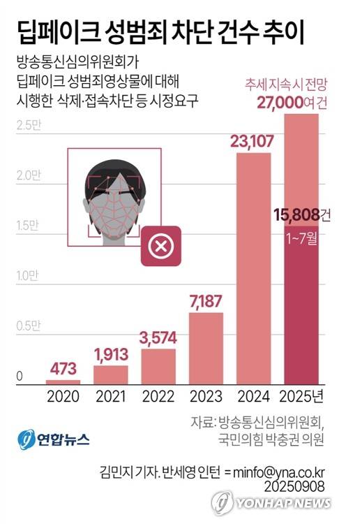 (서울=연합뉴스) 김민지 기자 = 8일 국회 과학기술정보방송통신위원회 소속 국민의힘 박충권 의원이 방심위로부터 받은 자료에 따르면 방심위가 올해 들어 딥페이크 성범죄영상물에 대해 한 삭제와 접속차단 등 시정 요구가 7월까지 1만5천808건에 이르는 것으로 나타났다.