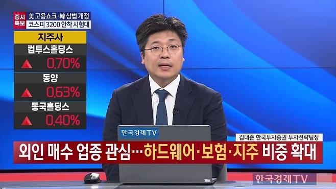 김대준 한국투자증권 투자전략팀장은 오늘(8일) 한국경제TV에 출연해 "상승 시 많이 오르고 하락 시 덜 빠지는 업종을 선택할 필요가 있다"며 "기술적으로 상승 베타와 하락 베타의 차이가 플러스인 업종(지주회사, 보험사, IT, 하드웨어) 중심의 선별적 대응을 추천한다"고 말했다.
