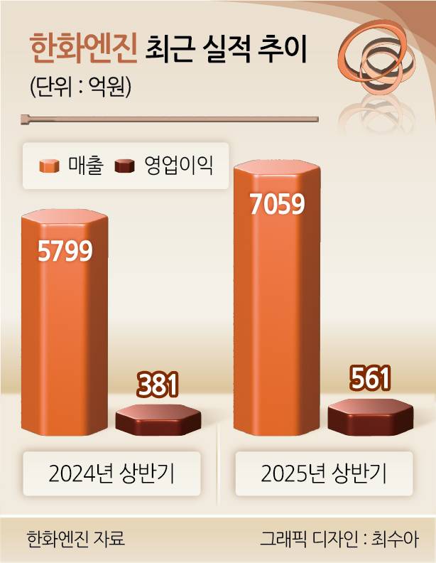 한화엔진의 올해 상반기 매출, 영업이익은 각각 7059억원, 561억원이다. 작년 같은 기간(매출 5799억원, 영업이익 381억원)보다 21.7%, 47.2% 증가했다. 수주액도 치솟고 있다. 올해 상반기 신규 수주액은 1조6179억원이다. 전년 동기(6469억원) 대비 2배 이상 늘어났을 뿐만 아니라 지난해 전체 수주액(1조6490억원)에 일찌감치 근접했다. 연이은 수주에 수주잔고는 지난 6월말 기준 4조139억원까지 상승했다. 지난해 말(3조3842억원) 대비 18.6% 늘었다.