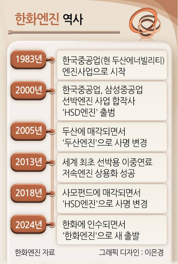 한화엔진은 최근 무서운 상승세를 달리고 있지만, 그 어떤 회사보다 많은 우여곡절을 겪었다. 대내외 불확실성을 이유로 모회사가 수시로 바뀌면서 사명 변경이 잦았다. 출발은 1983년 한국중공업(현 두산에너빌리티) 내 설립된 선박엔진 사업부이다. 이후 IMF 사태때 정부 주도의 산업 빅딜이 이뤄지는 과정에서 한국중공업과 삼성중공업의 선박엔진 사업 간 합작계약 체결이 이뤄지면서 HSD엔진이 탄생했다.