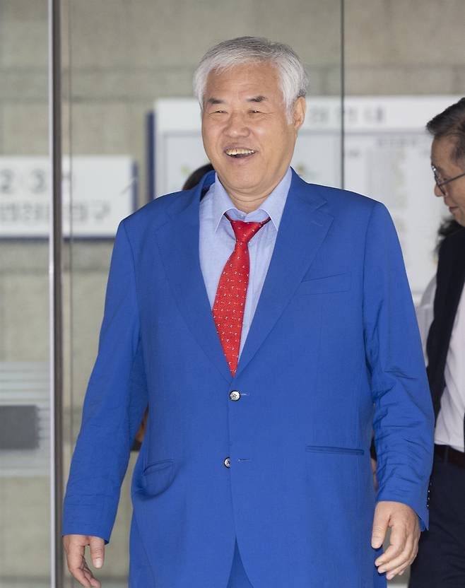 광장에서의 평소 모습처럼 파란색 양복에 빨간색 넥타이를 한 사랑제일교회 목사 전광훈씨는 법정을 빠져나오며 미소를 지은 채 자신의 변호인을 향해 말했다.
