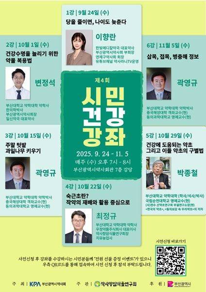 첫 강의는 24일 이향란 한빛메디칼약국 대표 약사(부산시약사회 부회장)가 맡아 ‘당을 줄이면, 나이도 늦춘다’라는 주제로 식습관과 건강의 상관관계를 짚는다. 이어 10월 1일에는 변정석 부산시약사회장이 ‘건강수명을 늘리기 위한 약물 복용법’, 10월 15일 곽영규 동의과학대 명예교수가 ‘주말 텃밭 과일나무 키우기’를 소개한다.