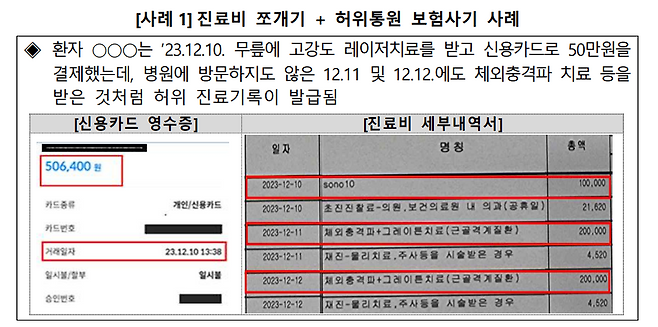 실제 사례에서는 환자가 무릎 고강도 레이저치료를 한 번 받고 50만 원을 결제했지만, 이후 방문하지도 않은 날짜에 체외충격파 치료를 받은 것처럼 기록이 남아 있었습니다.