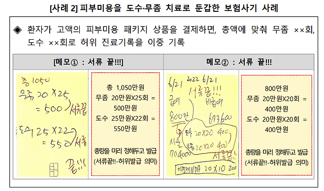 예를 들어 1,050만 원짜리 피부미용 패키지를 결제하면, 병원은 이 금액에 맞춰 도수치료 22회, 무좀 치료 25회 등으로 허위 진료기록을 나눠 발급했습니다.