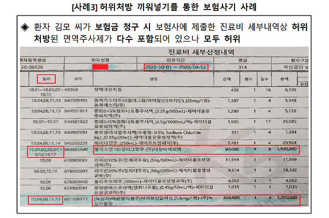 환자는 실제 치료비만 내고, 보험 청구용 진료내역은 부풀려서 제출하는 방식입니다.