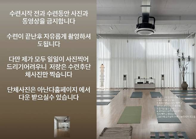 이효리는 8일 서울 서대문구 연희동에 오픈한 요가원 아난다 요가 첫 수업을 진행했다. 그는 "수련 시작 전과 수련 동안 사진과 동영상을 금지합니다. 수련이 끝난 후 자유롭게 촬영하셔도 됩니다. 다만 제가 모두 일일이 사진 찍어 드리기 어려우니 저랑은 수련 후 단체 사진만 찍습니다"라고 밝혔다.