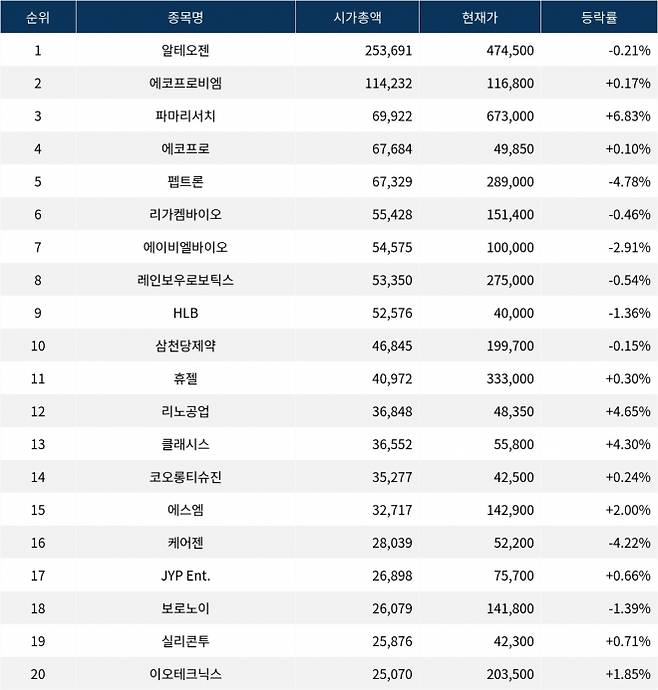 8일 한국거래소에 따르면, 시가총액 1위 알테오젠의 현재가는 474,500원으로 전 거래일 대비 0.21% 하락하며 약세를 보이고 있다. 외국인비율은 14.20%이며 거래량은 209,624주다. PER은 268.99로 나타났고 ROE는 29.52다. 시가총액 2위 에코프로비엠(247540)은 116,800원으로 전 거래일 대비 0.17% 상승했다. 외국인비율은 12.19%이며 거래량은 229,503주다. PER은 -147.47, ROE는 -6.26으로 나타난다.