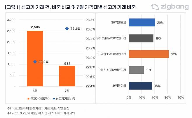 8일 부동산 플랫폼 직방이 국토교통부 실거래가 자료를 분석한 결과, 7월 서울 아파트 매매 3946건 중 신고가는 932건(23.6%)으로 집계됐다. 집값 상승세가 가팔랐던 6월(22.9%)보다 비중이 컸다. 신고가 비중은 2022년 7월(27.9%) 이후 3년 만에 최고치다.