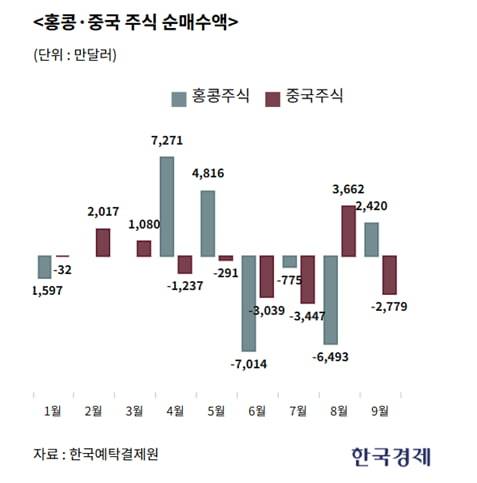 8일 한국예탁결제원에 따르면 중학개미들은 이달 들어(5일 기준) 홍콩 주식을 2420만달러(약 337억원) 순매수했다. 지난 5월 이후 8월까지 3개월간 순매도를 이어갔으나 이달 들어 다시 순매수로 전환했다. 지난달 중국 주식을 3662만달러어치 순매수하며 '사자'로 태세를 바꿨던 투자자들은 이달 다시 2779만달러어치를 순매도하며 '팔자'로 돌아섰다. 올해 고공행진하던 중국 상하이종합지수는 지난 2일부터 4일까지 3거래일간 2.86% 약세를 나타냈다. 중국의 금융규제 당국이 투기 거래 억제 조치에 나선다는 소식이 전해지면서 주가를 끌어내렸다. 9월 열병식 등 대규모 정치적 행사가 종료된 점도 차익 실현 매도세를 부추겼다.