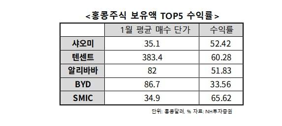 이들 주식 대부분 올해 양호한 수익률을 나타내고 있다. NH투자증권에 따르면 올해 1월 SMIC의 고객 평균 매수가격은 34.90홍콩달러로 올해 수익률은 약 65.62%로 나타났다. 이어 텐센트(60.28%)와 샤오미(52.42%), 알리바바(51.83%) 역시 50% 이상 수익률을 기록 중이다. BYD(33.56%)도 높은 성적을 거두고 있다.