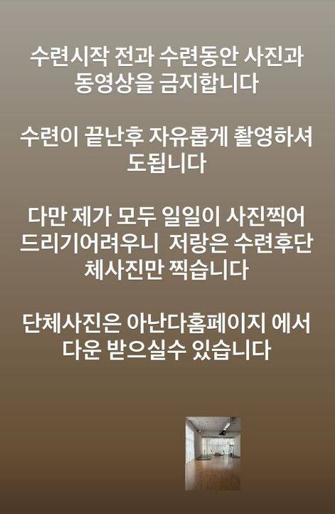 8일 첫 수업 시작을 알림과 동시에 "수련 시작 전과 수련 동안 사진과 동영상을 금지한다. 수련이 끝난 후 자유롭게 촬영하셔도 된다. 다만 제가 모두 일일이 사진 찍어드리기 어려우니 저와는 수련 후 단체 사진만 찍는다"라는 공지를 올리기도 했다.