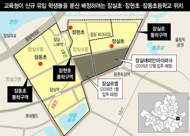 잠래아 쪽 학부모들은 황당하다는 반응이다. 잠래아가 재건축되기 전 잠실진주아파트였던 시절부터 초등학교 통학 구역상 잠실초 배정이 원칙이라는 것이다. 초등학교 1학년 아들을 둔 잠래아 입주예정자 남아무개(39)씨는 “코앞에 초등학교가 버젓이 있는데 큰길을 두 번 건너야 하는 초등학교로 아이들을 보내라는 주장은 같은 학부모로서 서운한 마음이 들 정도”라며 “입주 시기의 차이만 있을 뿐이지 잠실초를 파크리오가 지은 것도 아니고 공립학교를 특정 단지가 독점할 권리는 어디에도 없다”고 토로했다.