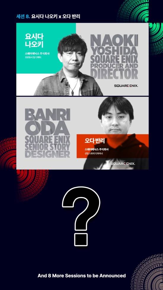 더불어 '파이널 판타지 XIV'의 요시다 나오키 프로듀서 겸 디렉터와 오다 반리 선임 스토리 디자이너도 무대에 오른다. 두 사람은 플레이어와 함께 만들어가는 온라인 게임의 서사적 가치와 전통적 스토리텔링과의 차이에 대해 직접 들려줄 예정이다.