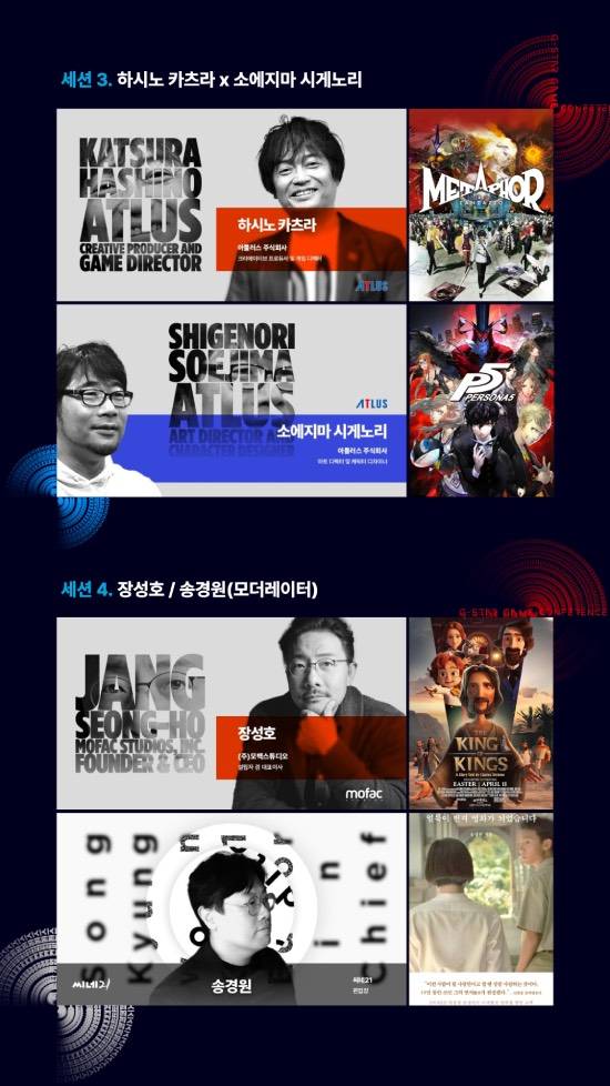 '페르소나' 시리즈의 하시노 카츠라와 소에지마 시게노리도 무대에 오른다. 이들은 이번 콘퍼런스에서 최신작 '메타포: 리판타지오'에 담긴 창작 철학을 공유할 예정이다