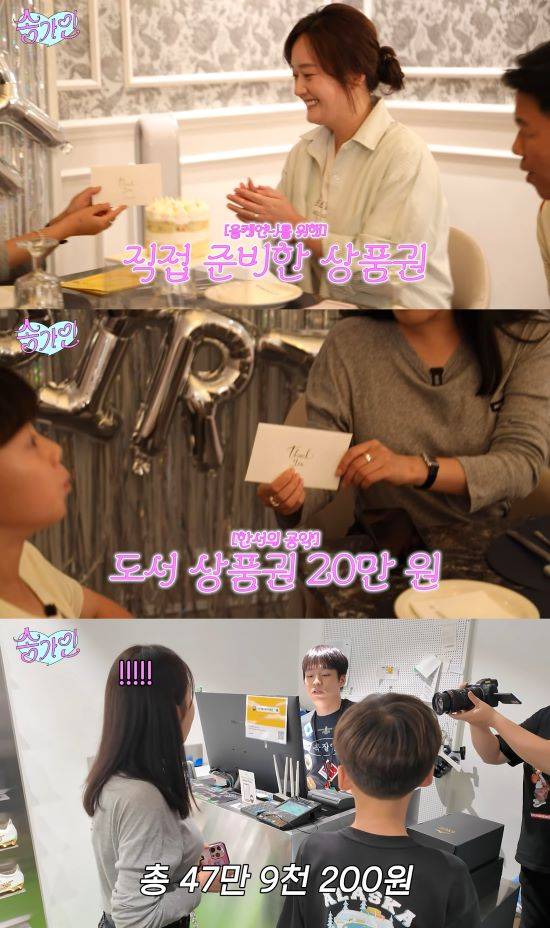이에 송가인은 "난 달력에 써놔서 알고 있었다. 선물은 안 사고 상품권을 준비했다"고 하얀 봉투를 전달했다. 또 "조카들 덕분에 조회수가 많이 나왔다"며 조카 한서에게 도서 상품권 20만원을 선물했다.