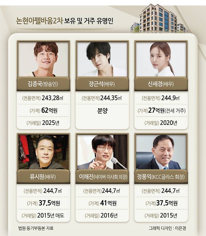 김종국의 매수로 다시금 주목받은 논현아펠바움은 고급빌라 시장에선 이미 인지도가 높은 단지다. 논현아펠바움2차에는 배우 장근석이 244.35㎡를 분양받아 아직까지 보유 중이고, 배우 신세경은 지난 2020년 244.9㎡를 보증금 27억원에 전세계약을 맺어 거주하기도 했다. 배우 류시원 또한 244.7㎡ 1가구를 분양받아 보유하다가 2015년 범 현대가 정몽익 KCC글라스 회장에게 37억5000만원에 매도했다. 네이버 창업자인 이해진 이사회 의장은 2016년 244.7㎡ 1가구를 41억원에 사들였다.