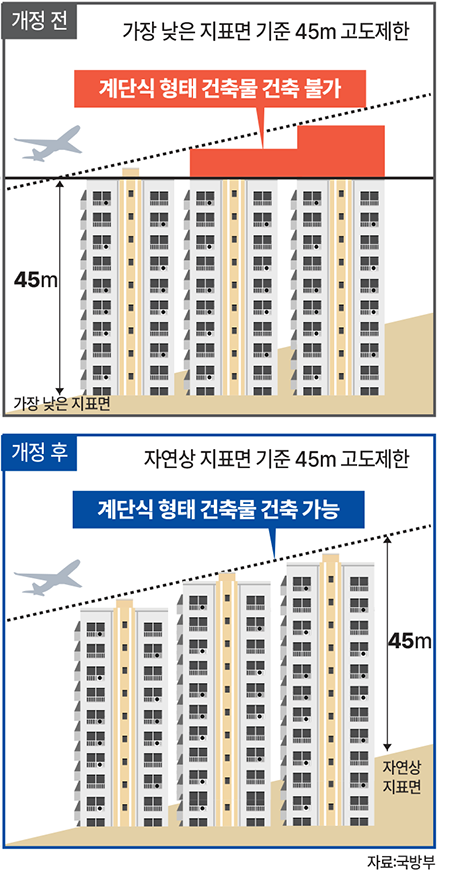 지난 8월 26일부터 시행된 국방부의 '군사기지 및 군사시설 보호법 시행령 개정안'은 건축물 대지 높이 산정 기준을 기존 '가장 낮은 지표면' 대신 '자연 상태의 지표면'으로 변경하는 것을 골자로 한다. 경사가 급할수록 계단식으로 건물을 올려 더 많은 세대를 확보할 수 있는 셈이다.