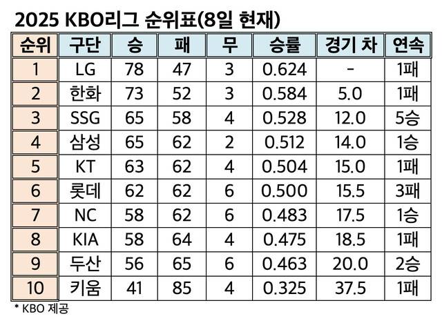 한편, 엘지(LG) 트윈스는 잔여 경기 결과에 상관없이 10개 구단 가운데 가장 먼저 포스트시즌 진출을 확정했다. 2019년부터 올해까지 7년 연속 가을야구를 한다.