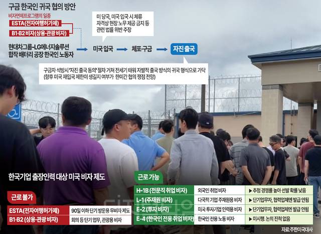 ◇트럼프 “한국과 좋은 관계”…“인재 입국절차 마련할 것”= 한국 정부는 외교 채널을 통해 미국과 사태 수습을 논의하고 있다. 조현 외교장관이 8일 워싱턴DC로 출국했다. 정부는 이들의 신속한 귀환을 위해 전세기를 띄울 예정이다. 귀국 일시는 10일쯤으로 예상된다. 이들은 미 이민당국에 재판보다는 모두 ‘자발적 출국’(Voluntary Departure) 방식을 선택한 사람들이다. 다만 자진 출국을 해도 추후 미국에 입국할 때 입국 제한이나 불이익 가능성이 제기되고 있다.