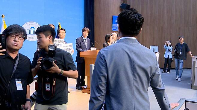 하지만 김 관장에게 장소를 대여해 준 국민의힘 김민전 의원은 김 관장의 발언이 끝나기도 전에 기자회견장을 떠났습니다. 이 모습을 지켜본 더불어민주당 이재관 의원은 대여 규정 위반이라 지적했고, 국회 사무처도 '김민전 의원의 부재'를 지적하며 김 관장에게 기자회견 중단을 요구했습니다.