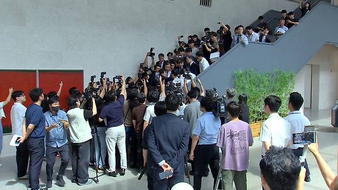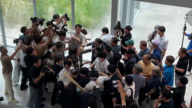 소통관 1층에서 항의를 위해 모인 시민들이 김 관장을 기다리고 있었고, 여기에 충남 지역 더불어민주당 의원들과 보좌진, 그리고 취재 인파까지 몰리며 소통관은 순식간에 아수라장으로 변했습니다.