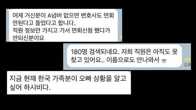 이 조사를 받아야 일종의 수감번호인 A 번호라는 게 나오고 면회가 되고 그다음에 변호사 면접을 할 수 있고 무슨 조치를 취할 수가 있는데 아직 100명 이상이 A 번호가 나오지 않았습니다.