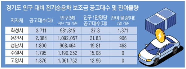8일 무공해차 통합누리집에 게시된 구매보조금 지급 현황을 바탕으로 경기도내 시 5곳(인구 90만명 이상)의 올해 7월 기준 인구와 전기승용차 일반 공고대수를 비교했다. 이를 인구 1만 명당 공고대수로 환산한 결과 지자체별 격차가 뚜렷하게 나타났다. 인구 1만 명당 공고대수는 화성시가 37.80대로 가장 많았고, 용인시가 21.83대였다. 반면 성남시는 19.81대, 수원시는 15.08대, 고양시는 12.96대에 머물렀다.