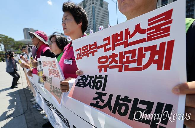 | ▲ 지난 6월 4일 전국교육공무직본부, 전국교직원노동조합, 전국학교비정규직노동조합, 참교육을위한전국학부모회, 평등교육실현전국학부모회, 혁신교육학부모네트워크 공동주최로 서울 종로구 정부서울청사 앞에서 '리박스쿨이 끝이 아니다! 극우세력의 학교 침투 발본색원! 공동 기자회견'을 하고 있다. |