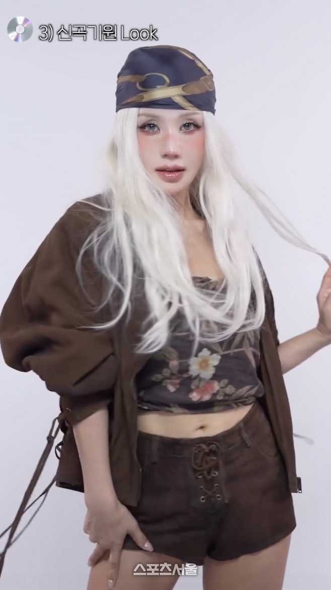 세 번째는 스트릿 감성을 담은 브라운톤 재킷과 반바지에 패턴이 들어간 탑, 그리고 스카프를 매치해 자유로우면서도 개성 넘치는 룩을 완성했다. 엄정화는 신곡기원 룩으로 이름 붙였다.